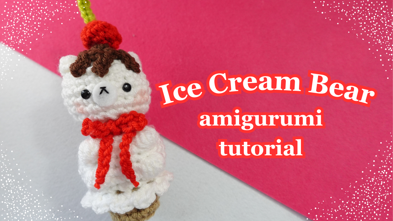 Leave long tail for sewing. Sew cherry to frosting using cherry’s tail. Attach frosting to bear’s head using frosting tail. Weave in all ends.