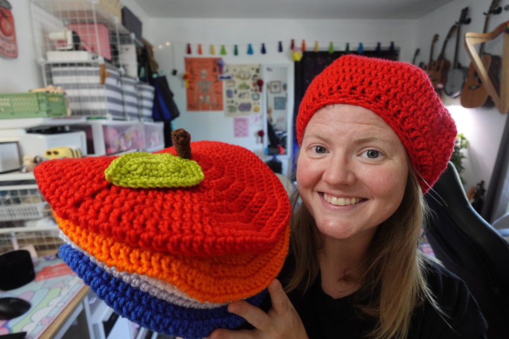 One of the things that I thought would be really cute to try at the market is this fruit beret! It’s made with worsted weight yarn and a larger crochet hook, so it’s light enough to wear in the summer, and it’s got a little leaf and stem attachment that makes it look like an apple, or peach, or blueberry, depending on the main color that you use!