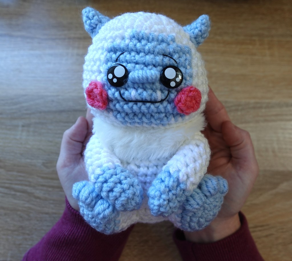 Time for another festive (and not-so-spooky cryptid) Buddy! I’ve had him sitting on my shelf in my office, staring at me for the last week or so, to remind me to type up his pattern and film his tutorial to share with everyone. Sometimes called the “Abominable Snowman,” this holiday cryptid is seriously the antithesis of abominable. Just look at that face: