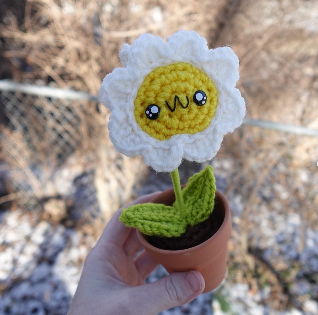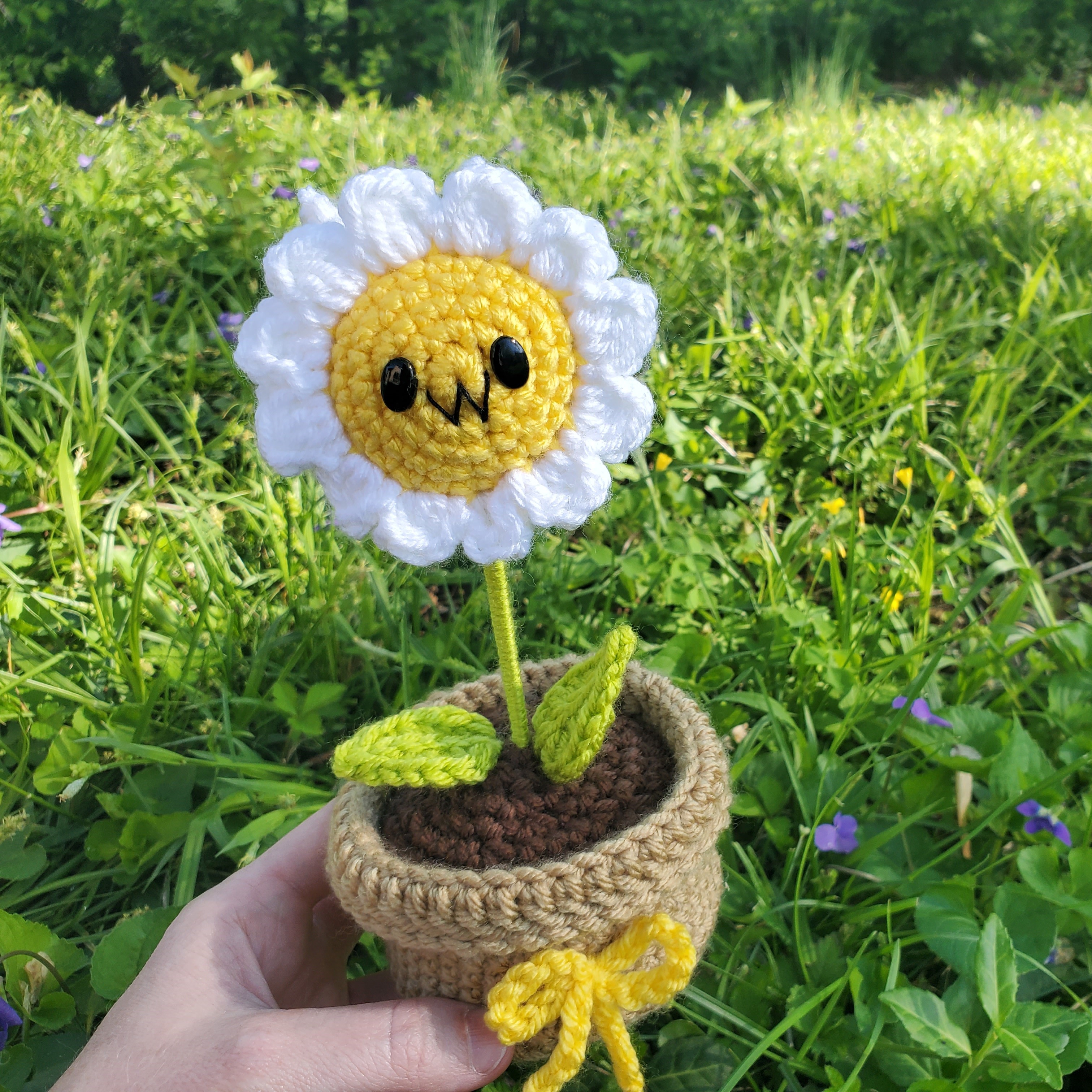 The idea is like his face is a little flower, and then BAM, when you turn him around, and he’s a bee! I made a few modifications to him, though – since I know not everyone has access to the same size terracotta pots I like to use, I decided to whip up a cute crochet flower pot for him, complete with sweet little bow.
