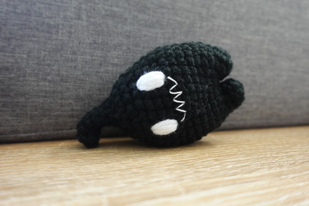 With white yarn, sew each eye by stacking 5 stitches into an oval shape between Rnds 7-10 on the body (space between Rnd 7 & 8 for the bottom of the eye, space between Rnd 9 & 10 for top of eye). Sew both eyes in this manner, so they’re centered on the front of the body (“stem” should be swirled off to the left hand side!). Once sewn, tie a knot and weave in any remaining tail.